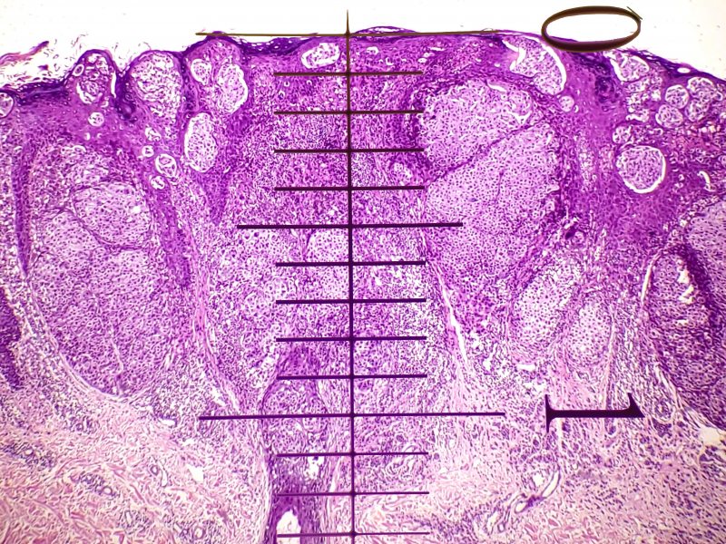Um dos principais fatores prognósticos em melanoma cutâneo é o Índice de Breslow, que representa a espessura tumoral. Ele é medido a partir da camada granulosa da epiderme até a célula tumoral invasora mais profunda da derme.